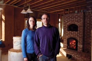 Kim ’94 and Mike ’94 Martin are living in a trailer on their land in Greencastle, Pennsylvania, during the construction of their straw bale house – its wood-burning masonry stove already works fine. A service term in Mexico partly inspired their commitment to simple living.