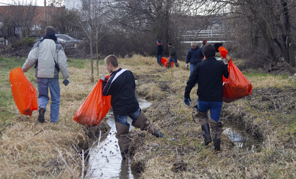 EMU students took part in MLK Day of Service and Learning by helping remove trash and debris from Blacks Run in Harrisonburg. Photo by Jon Styer.