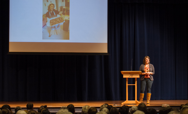 Rachel Held Evans, one of the most influential and quoted persons in the Millennial generation of Christians, told a near-capacity crowd in Lehman Auditorium that gender roles reduce womanhood down to a list of acceptable roles ... “It’s not about acting like a man or acting like a woman. What matters is where you find yourself as a follower of Jesus. It’s not really about roles, it’s about character." (Photo by Lindsey Kolb)