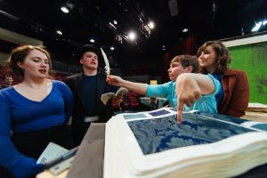 The show also has grown out of improvisations and the actors’ creativity and unique interpretation, said Clara Bush. The junior theater major plays the three main female roles. “It isn’t like a standard play you would go to see. It is inventive, truly special, and absolutely hilarious. I have laughed harder working on this show than I have in a long time.”