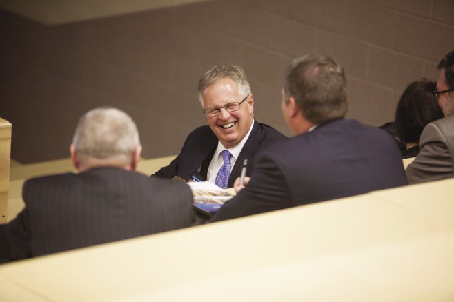 Loren Swartzendruber ’76, Mdiv ’79, chats with Daryl Gert ’97 (right), vice president for finance, and Phil Helmuth ’76 & ’02, executive director of development, in the Suter “head room.”