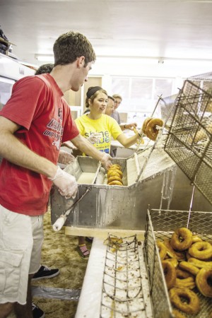 Homemade donuts are a major attraction. Lois Wenger ’76, heads the popular donut-production operation.