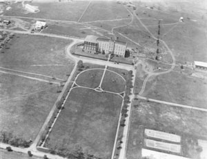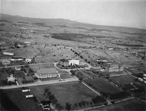 Aerial photo of the campus in the mid 1950s, looking west. Lehman Auditorium is at the lower left. The Ad Building, with its two annexes, is in the middle – note the parking and driveway directly in front. Northlawn is at right, with “X-Hall” behind it. On the hill above stands the observatory.