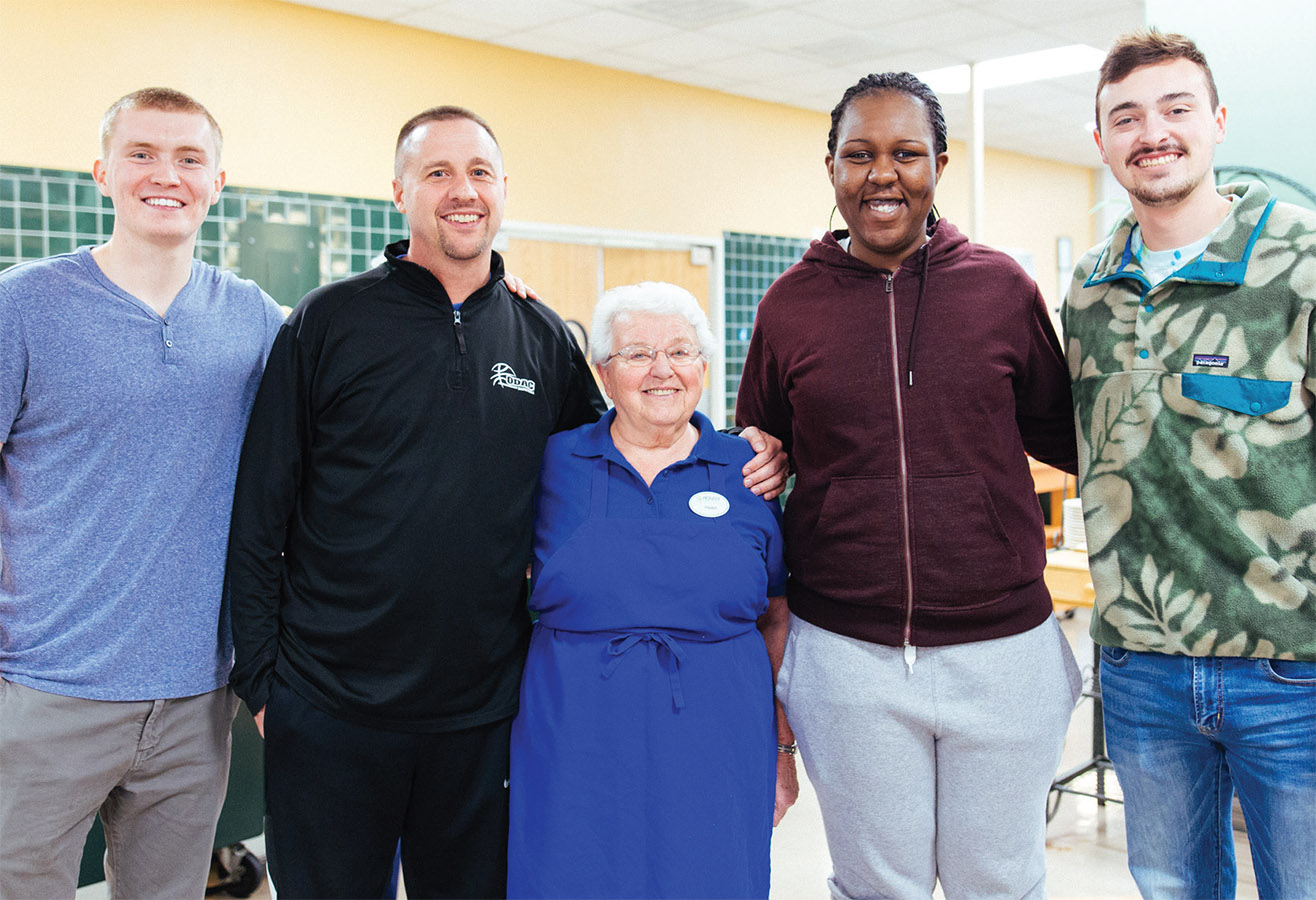 Longtime Snack Shoppe manager Helen Ours still works in the Eastern Mennonite University Dining Hall and treasures her relationships with students. Here she is with Travis Clower, head basketball coach Kirby Dean ’86, Jonae Guest and Christian Taylor. Dean has fond memories of eating there after basketball practice, “the closest thing to going home,” he said. (Photo by Andrew Strack)