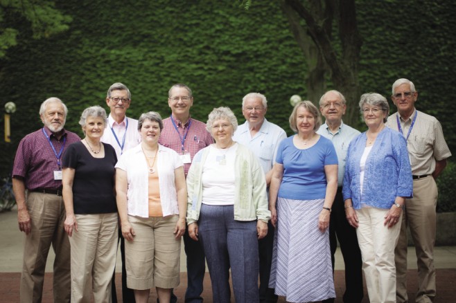 In June, 11 donors to the Suter Science Campaign posed for this EMU photo at the 2013 meeting of the Mennonite Healthcare Fellowship in Goshen, Ind.: (from left) Stanley Godshall ’65, MD, & Susan Godshall ’65 (former chair, EMU board of trustees) of Mount Joy, Pa.; Joseph Longacher ’59, MD, of Harrisonburg, Va.; Evelyn & Dan Nafziger, MD, both ’83, of Goshen, Ind.; Phyllis & Elton Lehman ’58, MD, of Mount Eaton, Ohio; Shirley ’57 & Arlen Delp ’60, MD, of Milwaukee, Wis.; Rachel ’61 & Joseph Martin ’59, MD, of Brookline, Mass.