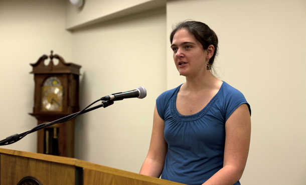 Emily Harnish, a senior biochemistry major from Strasburg, Pa., won first place with her speech, “Lessons from the hymnal in an election season.” In her speech, Harnish explains her anger over the non-peaceful manner of politics during the 2012 election and how the hymn, “Let All Mortal Flesh Keep Silence,” made her think about peace in a new way.