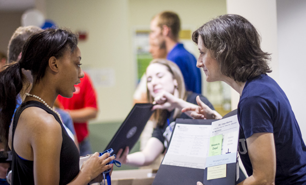 First-year student Brittany Williams chats with Deirdre Smeltzer, vice president and undergraduate academic dean, during the days of orientation and registration prior to the first day of classes in 2014-15. (Photo by Jon Styer)