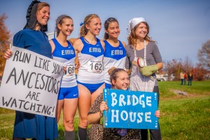 Jolee Paden with fellow Bridge House residents after the Oct. 31 ODAC cross country championships: (from left) Brooke Lacock, Jolee Paden, Hannah Chappell-Dick, Juni Schirch, Louise Krall, and kneeling, Alicia Poplett. Bridge House is an intentional community adjacent to campus where residents host social gatherings designed to bring together upper- and underclass students.