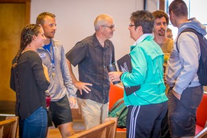 Jolee Paden greets well-wishers after her chapel presentation: (from left) head cross country and track coach Britten Olinger, campus pastor Brian Martin Burkholder, and physical education professor Sandy Brownscombe.