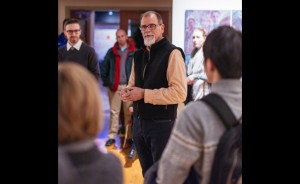 The various stages and layers of the paintings could take up to two days to dry, so Holsopple would have as many as 15 panels in process at any given time. In all, he created nearly 60 panels, most of which are part of an exhibit at EMU that debuted Feb. 12 in the Margaret Martin Gehman Art Gallery. Titled “7 x 7 Laments: For An Age of Sexualized Power,” the exhibit drew a large crowd to the opening.