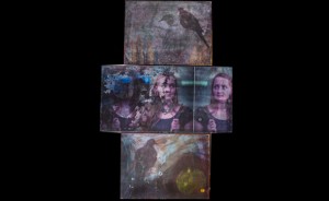 Holsopple explored this topic through a process of photo transfer. He began with thick, broad splashes of paint on each panel, then transferred inks from his photographs onto the paint. Using pallet knives, sandpaper and other tools, he added different textures to each piece, revealing or hiding various parts to create the desired effects.
