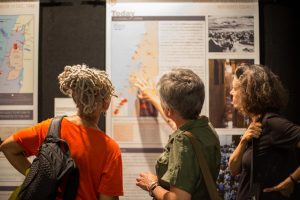 The exhibit features maps, photographs, and graphs outlining significant historical events in Palestine; photographs of nonviolent resistance in the West Bank; paintings by Palestinian artists living in refugee camps; and video accounts of the Nakba.