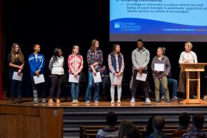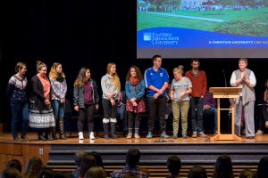 Campus Undergraduate Pastor Lana Miller recognized ministry assistants who are departing on cross-culturals next semester: Shelby Alto, Taylor Martin, Elizabeth Witmer, Elizabeth Resto, Kieran O’Leary, Marina Baker, Esther Ghale, Lydia Musselman and Ethan Herman. Ministry assistants, known on campus as MAs, integrate faith into practice in their residence halls and volunteer their time to assist others. Miller thanked them for “joining us as campus pastors.”