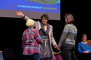Vice President of Student Life Ken L. Nafziger kicked off the chapel by urging participants to join wholeheartedly into the celebration of the semester’s achievements. “We often celebrate but in a muted fashion,” he said, “so let’s not be that way today.”