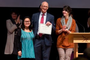 Actors Emma Roth and Belen Yoder were nominated from the fall production of “Far Away” by an independent respondent to participate in the Kennedy Center American College Theatre Festival (KCATF) Irene Ryan Scholarship Audition. They will participate in the Region 2 festival Jan. 3-7 at Montclair State University in New Jersey. Professor Heidi Winters Vogel presented the award.