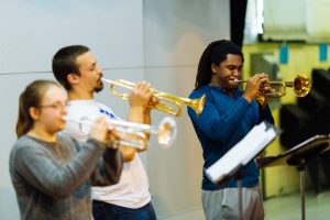 Many of the students bring instrumental experience but are new to jazz, like math education sophomore Madalynn Payne, who has played trumpet for seven years. Sophomore biology major Isaac McCauley played euphonium in high school, then taught himself trombone over the past three years before joining jazz band.