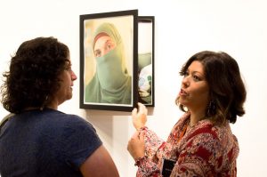 For the presentation, Alhasawi hung twenty hinged portraits in the gallery – the viewer first encountered a fully veiled woman, eyes appearing somber or powerful, a few mischievous – then “opened” the portrait to reveal the subject with only partially covered hair.