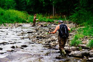 The research project meant long days in hip waders, carrying measuring tapes and other instruments through the rock-strewn bottoms of Crab Run and the German River. They were joined on some days by Bergton native Bekah Mongold, a junior biology major.