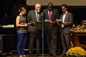 Sunday’s traditional worship service tied past, present and future together. Read coverage here and listen to the podcast here. Also present and part of a litany reading were alumni award recipients Chester ’36 and Sara Jane ’42 Wenger, Centennial Award; Anxo Perez ‘97, Alumnus of the Year; Leonard Dow ’87, Distinguished Service; Laura Rosenberger ’03, Young Alumnus; and John and Michelle Sharp, parents of Life Service Award honoree Michael J. Sharp ‘05.