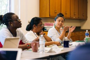Theresa Gusim (from left), Elizabeth Krishna and Sumina Karki discuss a concept during Roy Hange’s “Faith-Based Peacebuilding” during SPI Session 1.
