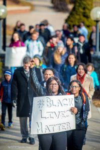 - In her opening remarks, MLK Week committee co-chair and graduate student Oksana Kittrell said that the week was a call to action: “As you focus in on this idea of staying ‘woke’ in a time of oppression for not just brown bodies, but white ones as well, I encourage you to take what you have seen here, learn and experience today, and take the first step, to just stand. Stand on behalf of those who cannot. It’s time for change.”