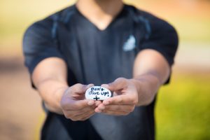 Sophomore Yoel Bobadilla had painted farm building silhouettes against vivid sunset colors, representing his love of the countryside. First-year Zach Shifflett, hungry and on his way to lunch, was painting careful yellow dots onto a red stone – a strawberry – and said he appreciates the people who prepare the food he eats. And pastoral assistant and senior Bekah Mongold had painted “You are loved” on another.