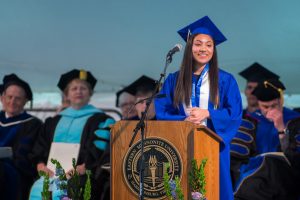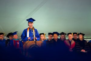 James Ramsey III spoke on behalf of those students who returned to complete their college education after walking “different paths:” starting families and careers, taking care of sick family members, or recovering from illnesses. Desiring to “learn more, to do more and to be more,” this particular group of students sustained each other as they traveled. “We have been empowered with tools to create connection, effect change, and leave the world better than when we found it,” he said. “We are proof that the biggest challenges have the greatest rewards.”
