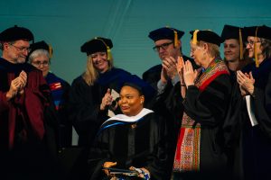 In a Commencement address titled “Urgently Needed! Defenders of Peace and Justice,” Gbowee offered statistics about the rising numbers of global conflicts, armed and insurgent groups, drug cartels, terror attacks and deaths. “Beyond these numbers, when we look around our world, especially in places people never think about, you have issues of housing crisis, you have rape and exploitation of women in different parts of the world, the threat to the environment and many other vices.”