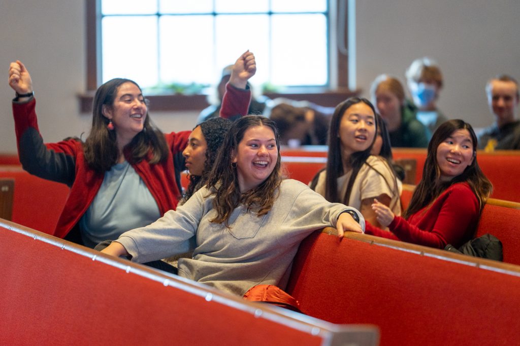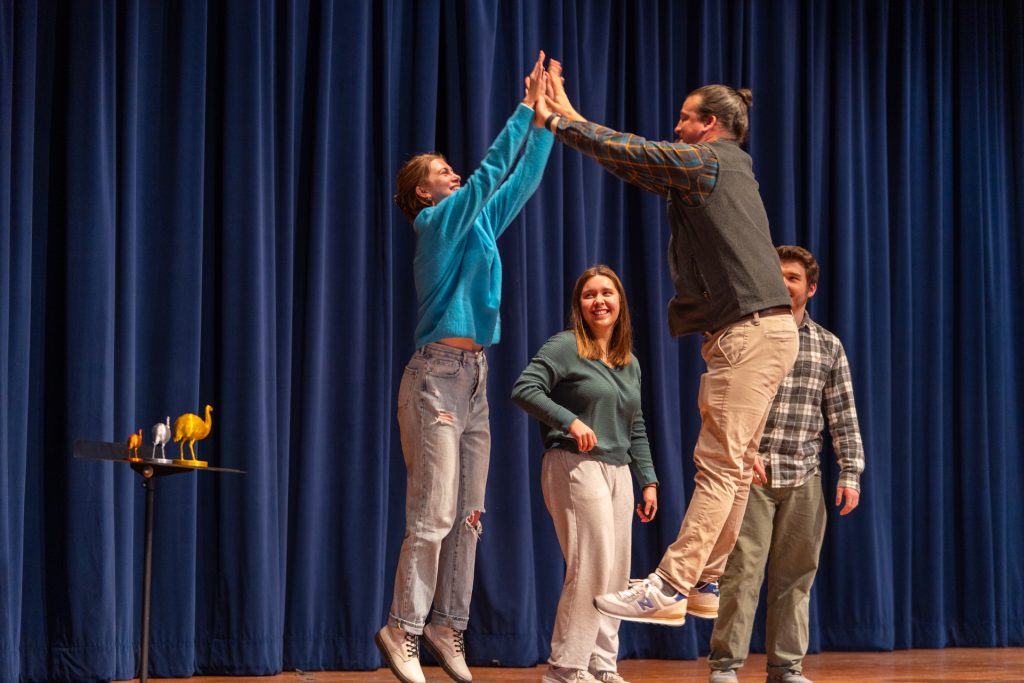 Kyle Remnant congratulates Daisy Buller with an aerial high-five during Wednesday's Student Recognition Celebration at Lehman Auditorium, while Renae Benner and Isaac Greenleaf look on.