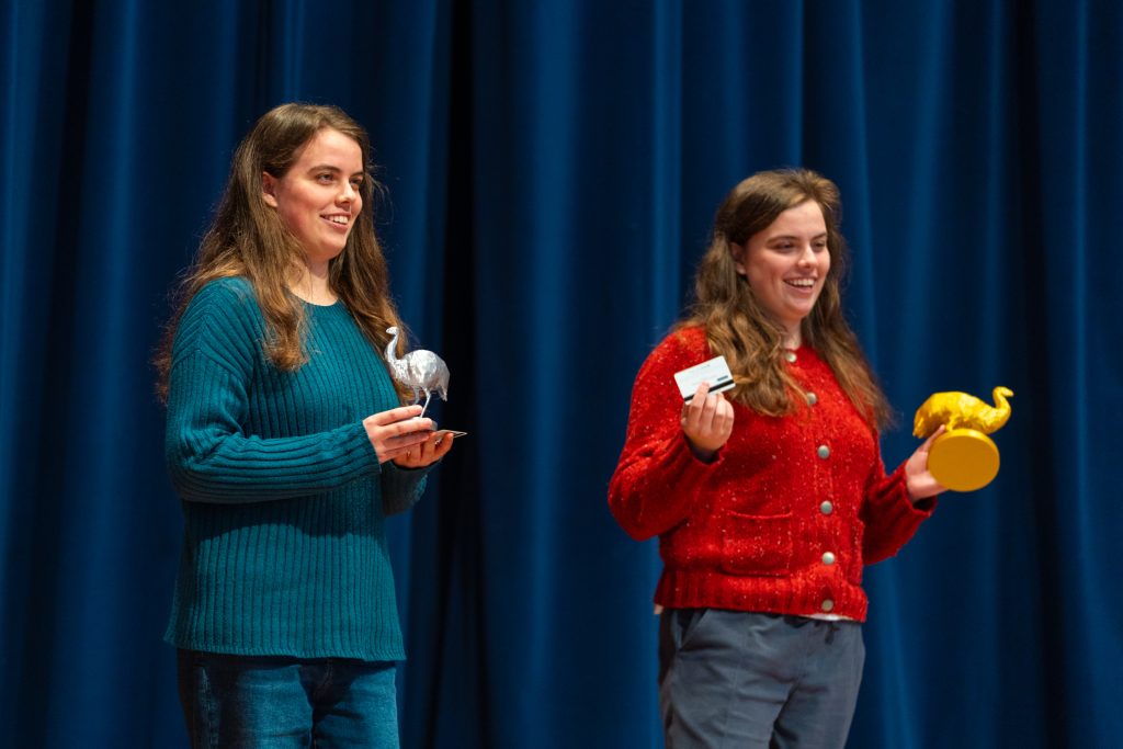 Mara and Lisa Zimmerman received silver and gold emu trophies for earning the most Engage Points this semester.