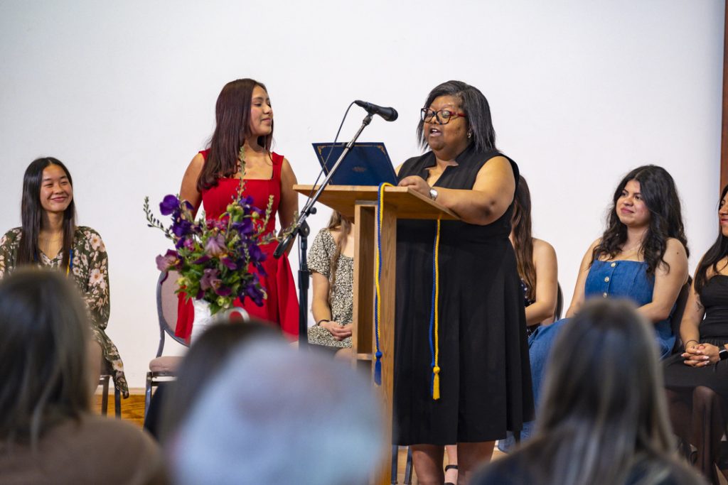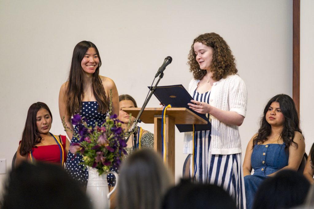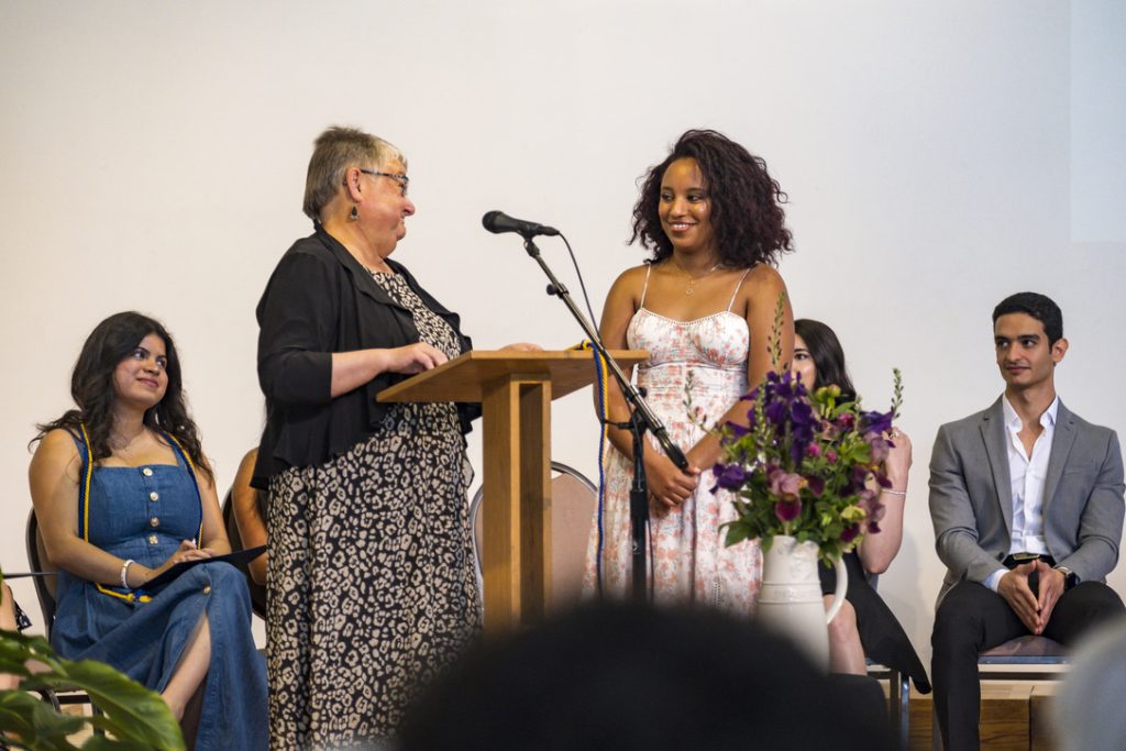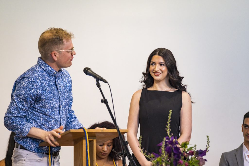 “You are one of the most compassionate, driven, and engaged people I know, and your persistent dedication to caring for and including those around you is wildly inspiring,” she said. “Your determination to ensure that everyone feels they belong and have a safe space to be themselves, drawn from your own experience and vulnerability, shines through in your many involvements across campus.”