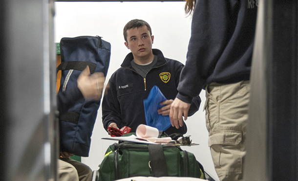 Clockwise from top left: Blake Rogers ’14 helps Clover Hill EMTs check inventory in one of their ambulances at the station in 2014. | Rogers speaks during a 2015 workshop for the Shenandoah Valley Soil and Water Conservation District. | Then a physician assistant student at JMU, Rogers receives the 2018 PA Student of the Year Award. | Rogers ’14 and Matt Tieszen ’10, MA ’15 (biomedicine), return from an elective clinical rotation at Shirati KTM Hospital in Tanzania in 2018.