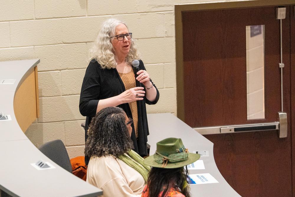 Dr. Rachel Levine introduces herself at Friday’s mural dedication ceremony in Suter Science Center 106. Seated to her right are EMU Interim President Rev. Dr. Shannon W. Dycus and artist and scientist Pınar Ateş Sinopoulos-Lloyd.