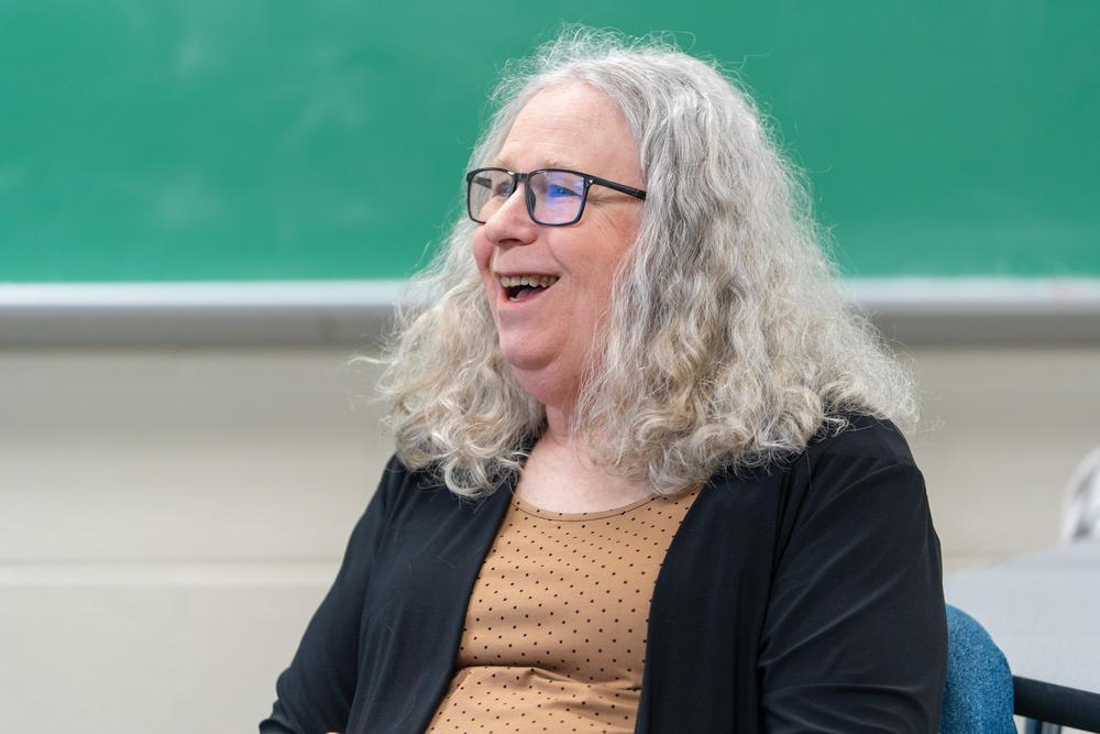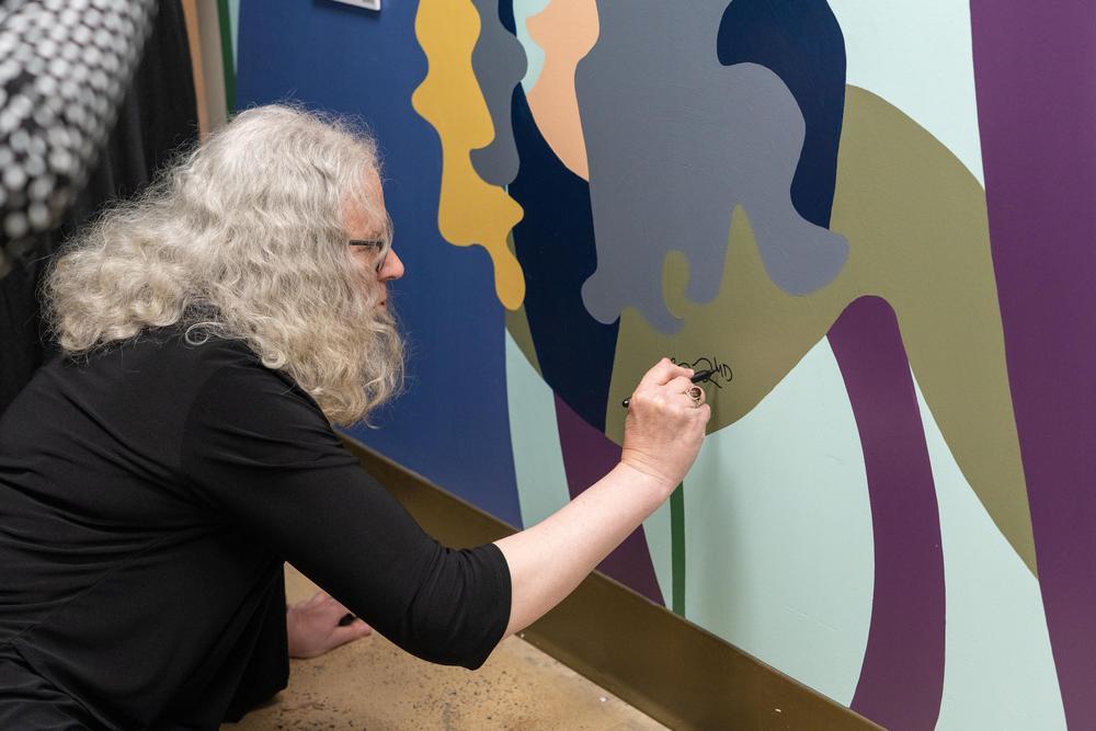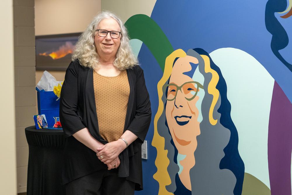Dr. Rachel Levine, the first openly transgender federal official confirmed by the Senate, signs her portrait on the Suter Science Center mural