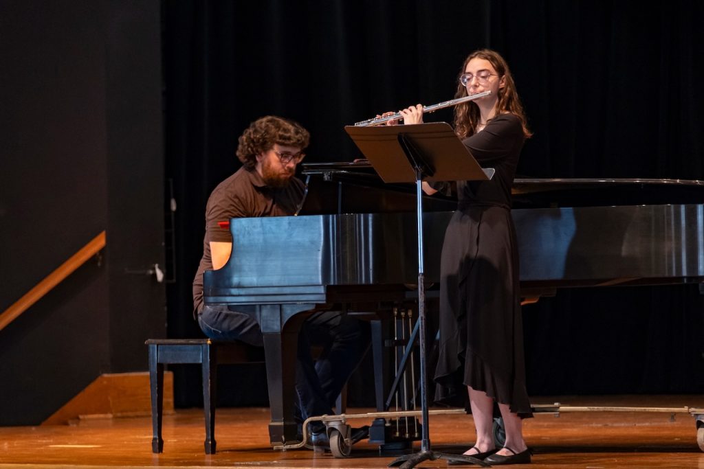 A student recital at Lehman Auditorium featured performances by vocalists Mac Rhodes-Lehman (bass) and Eli Stoll (baritone), pianists Rafael de Tablan and Micah Wenger, violinist Miriam Rhodes, violist Monica Ehrenfels, flautist Nina Dunsmore, and guitarist and vocalist Erin Yoder (alto). The musicians were accompanied by Harold Bailey and Dominic Baldoni on piano.