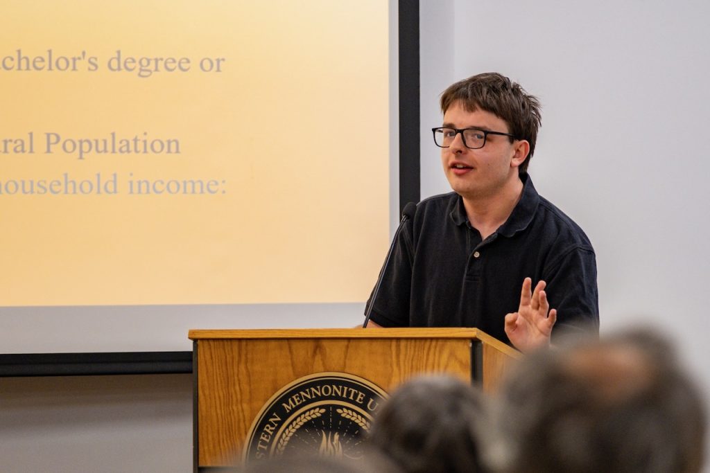 Like many students on campus, engineering senior Levi Stutzman had a busy day of presentations. He was part of a cohort that tracked EMU’s carbon emissions and presented findings showing the university is not on track to reach its goal of carbon neutrality by 2035 (as outlined in its Climate Action Plan).