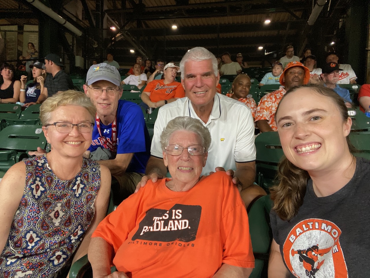 Clockwise from front center: Miriam “Mim” Mumaw ’61, Liz Chase Driver ’86, David Driver ’85, former Orioles player Larry Sheets ’83, and Stephanie Rheinheimer ’14 attend an Orioles baseball game in August 2022. Sheets told writer David Driver for the Augusta Free Press: “Mim was, first and foremost, a wonderful Christian woman, a huge fan of EMU, and a huge supporter of my career and then my son’s (Gavin Sheets’) career.” (Photo courtesy of David Driver/AFP)