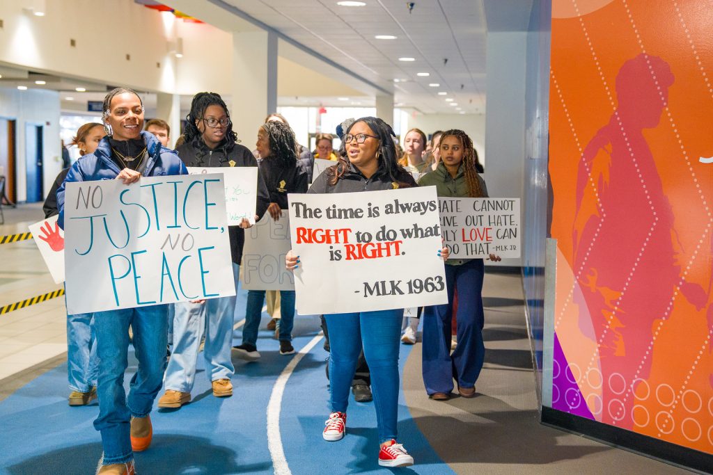 Monday’s events began at 9:45 a.m. with a unity march inside the University Commons. About two dozen students, faculty, and staff members held signs calling for peace and justice as they completed three laps around the indoor track. Each year, the unity march pays tribute to the many nonviolent marches led by Dr. King and others during the civil rights movement.