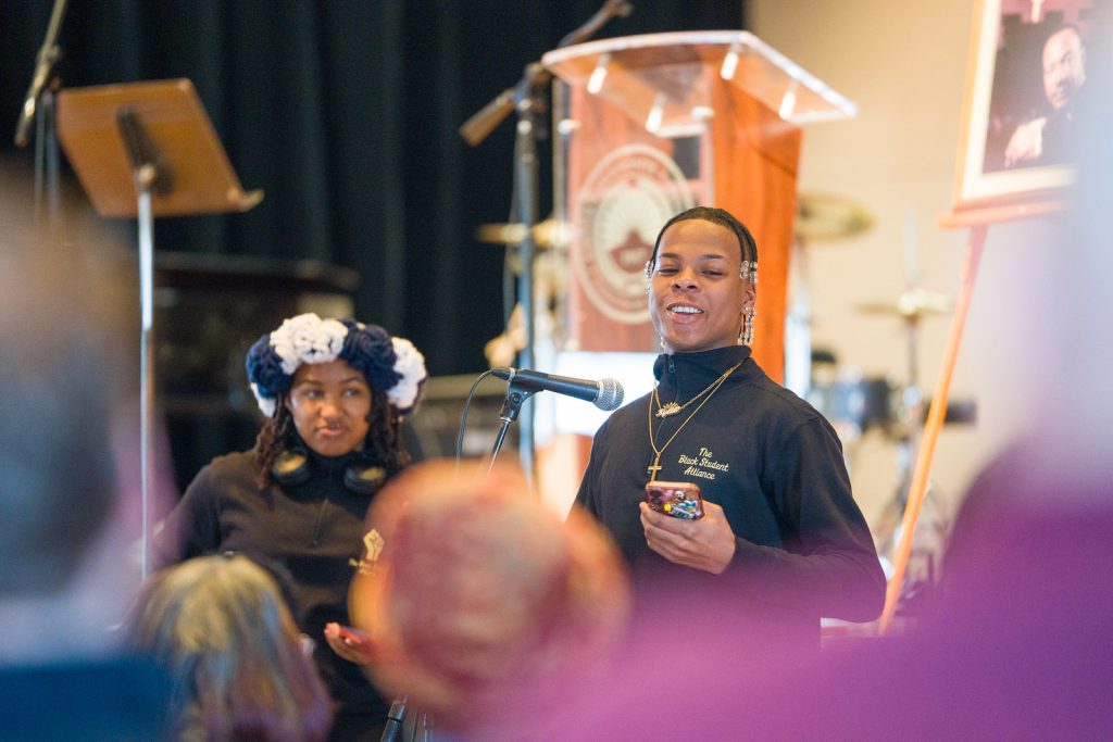 The group of marchers proceeded to Lehman Auditorium, where members of the Black Student Alliance (BSA) and other students shared quotes from Dr. King and reflected on his legacy during Speak Out. One quote that resonated deeply was: “Injustice anywhere is a threat to justice everywhere.”