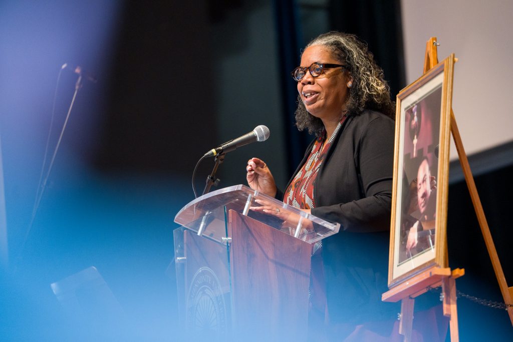 Harrisonburg Mayor Deanna Reed, director of alumni engagement and community connections at EMU, spoke about the theme of the day. “Going beyond the dream means understanding justice is not passive,” she said. “It requires participation, it requires responsibility, and that’s where you come in, EMU students. You’re not on the sidelines of this work. You are already shaping the future of communities like Harrisonburg through the choices you make, the careers you pursue, the voices you raise, and the values you carry forward. Don’t just remember him, carry his dream forward.”
