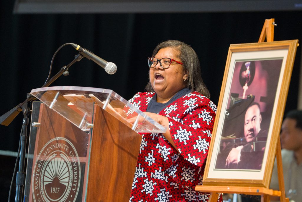 Celeste Thomas, director of Multicultural Student Services at EMU and chair of the committee planning the MLK Jr. celebration, said Dr. King imagined a world with community instead of chaos, love instead of hate, and no one going hungry. He imagined a world where families are not separated, where there are no food deserts and everyone has clean water, and where countries don’t bully one another for resources, she added. “Beloved community is sustainability for all mankind,” she said.