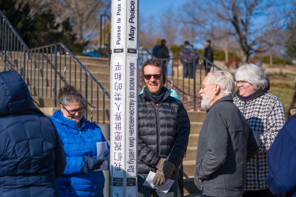 Following the convocation, a ceremony on Thomas Plaza rededicated the EMU Peace Pole with a vision for peace, justice, and shalom on Earth, including all living things (represented by a new plaque featuring animal prints). The Peace Pole was recently resealed and painted and has newly installed “May Peace Prevail on Earth” plaques.