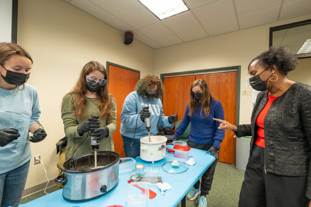 Simone McKelvey of Simone & Tuesday (pictured on right) guides students in crafting their own handmade soap. She has been making her own soap since 2013 and sells her soap at the Staunton Farmers’ Market.