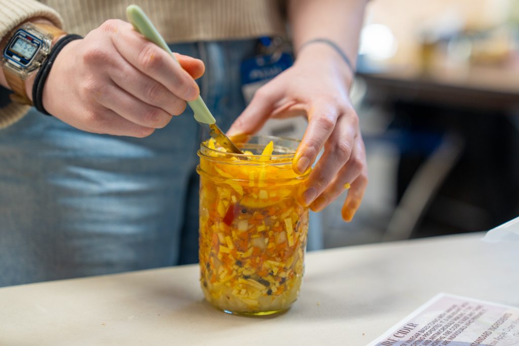 A student participating in a fire cider demonstration on Monday fills a glass jar with ingredients submerged in apple cider vinegar.