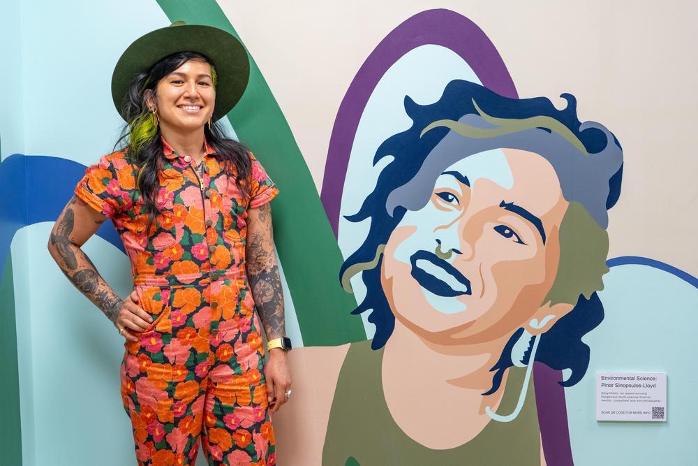 Dr. Rachel Levine (left) and Pınar Ateş Sinopoulos-Lloyd (right) pose next to their portraits on the mural.