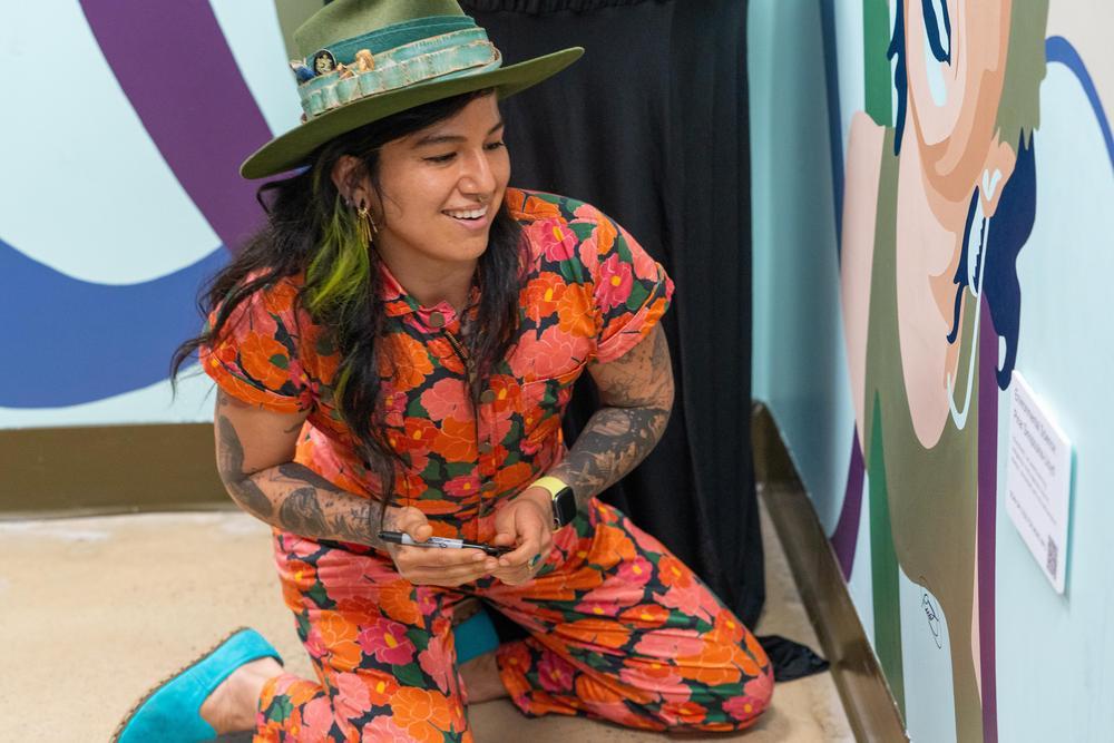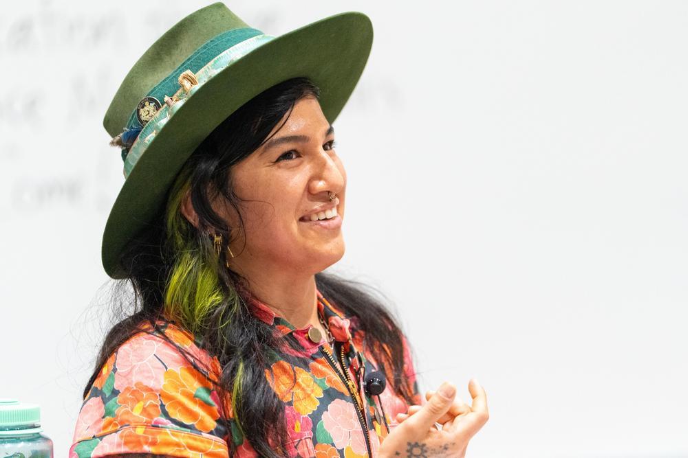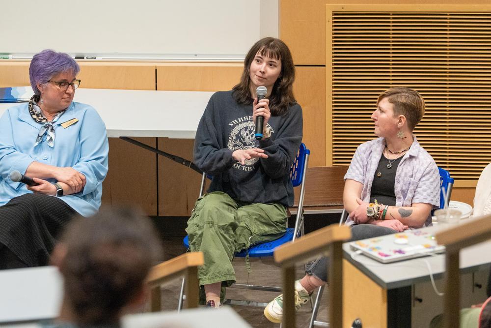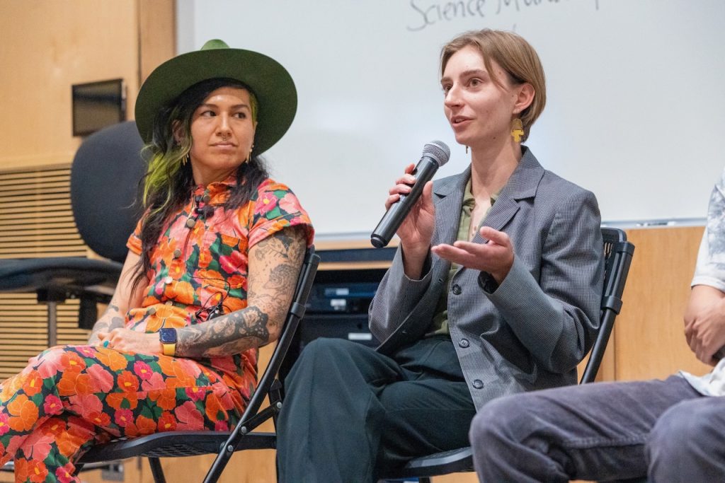 Afton Rhodes-Lehman ’24, who helped design and paint the mural, speaks during a panel conversation (left). Veronica Horst ’23 reflects on the mural (right) while Pınar Ateş Sinopoulos-Lloyd looks on.