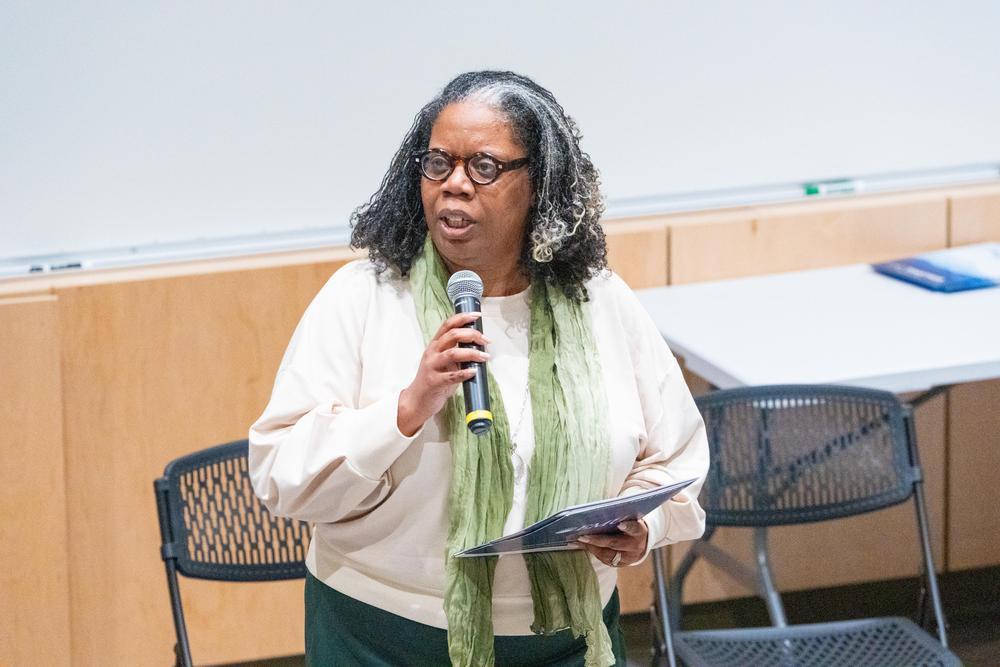 Interim President Rev. Dr. Shannon W. Dycus presents her remarks at a dedication ceremony for the Inclusivity in Science Mural.